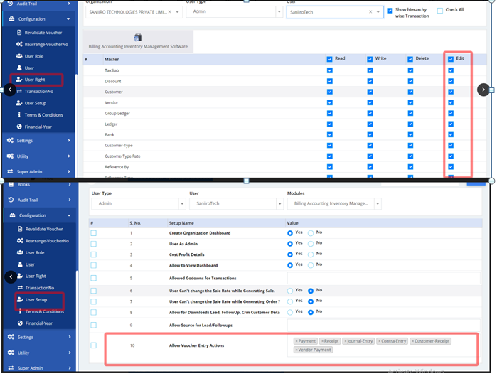 1. Voucher Entry Actions rights (Customer-Receipt, Vendor-Payment, Contra, Journal, Receipt, Payment) manage by User Setups Settings under Configuration >> User Setup, To Edit the voucher entry- The setting name Allow voucher entry actions.
